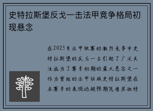 在2025年法甲联赛的激烈竞争中,史特拉斯堡的“反戈一击”引起了广泛关注,成为了赛季初期的最大悬念之一。作为曾经的法甲劲旅,史特拉斯堡在本赛季的表现远超预期,凭借其独特的战术打法和坚韧的球员精神,他们...